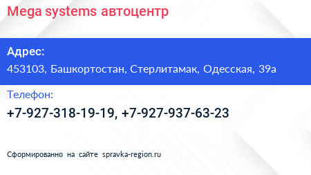 Mega-systems, автоцентр по адресу 453103, Башкортостан, Стерлитамак, Одесская, 39а в дальнейшем Организация, размещена в следующих категориях: