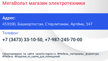 МегаВольт, магазин электротехники по адресу 453100, Башкортостан, Стерлитамак, Артёма, 147 в дальнейшем Организация, размещена в следующих категориях: