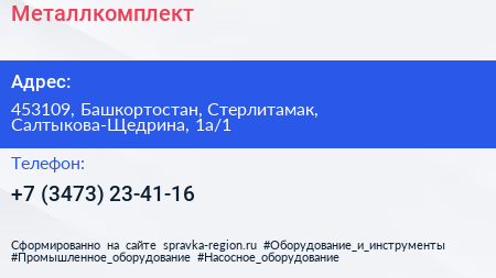 Металлкомплект по адресу 453109, Башкортостан, Стерлитамак, Салтыкова-Щедрина, 1а/1 в дальнейшем Организация, размещена в следующих категориях: