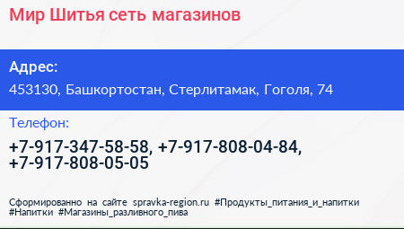 Мир Шитья, сеть магазинов по адресу 453130, Башкортостан, Стерлитамак, Гоголя, 74 в дальнейшем Организация, размещена в следующих категориях: