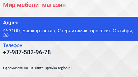Мир мебели+, магазин по адресу 453100, Башкортостан, Стерлитамак, проспект Октября, 36 в дальнейшем Организация, размещена в следующих категориях: