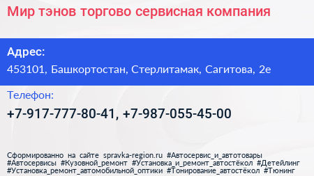 Мир тэнов, торгово-сервисная компания по адресу 453101, Башкортостан, Стерлитамак, Сагитова, 2е в дальнейшем Организация, размещена в следующих категориях: