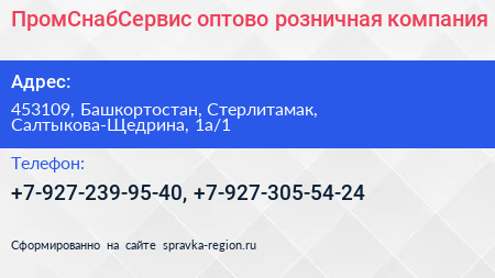 ПромСнабСервис, оптово-розничная компания по адресу 453109, Башкортостан, Стерлитамак, Салтыкова-Щедрина, 1а/1 в дальнейшем Организация, размещена в следующих категориях: