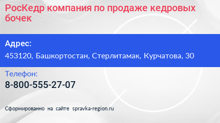 РосКедр, компания по продаже кедровых бочек по адресу 453120, Башкортостан, Стерлитамак, Курчатова, 30 в дальнейшем Организация, размещена в следующих категориях: