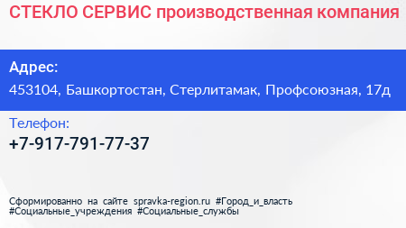 СТЕКЛО-СЕРВИС, производственная компания по адресу 453104, Башкортостан, Стерлитамак, Профсоюзная, 17д в дальнейшем Организация, размещена в следующих категориях: