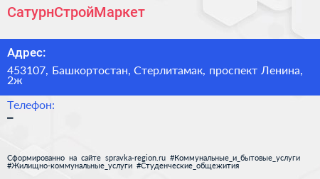 СатурнСтройМаркет по адресу 453107, Башкортостан, Стерлитамак, проспект Ленина, 2ж в дальнейшем Организация, размещена в следующих категориях: