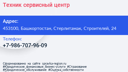 Техник, сервисный центр по адресу 453100, Башкортостан, Стерлитамак, Строителей, 24 в дальнейшем Организация, размещена в следующих категориях: