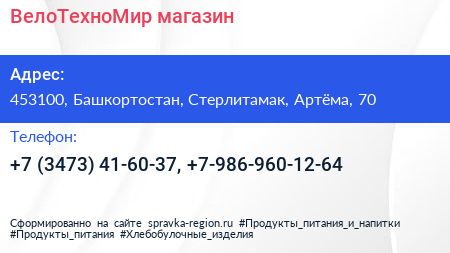 ВелоТехноМир, магазин по адресу 453100, Башкортостан, Стерлитамак, Артёма, 70 в дальнейшем Организация, размещена в следующих категориях: