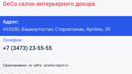 DeCo, салон интерьерного декора по адресу 453100, Башкортостан, Стерлитамак, Артёма, 29 в дальнейшем Организация, размещена в следующих категориях:
