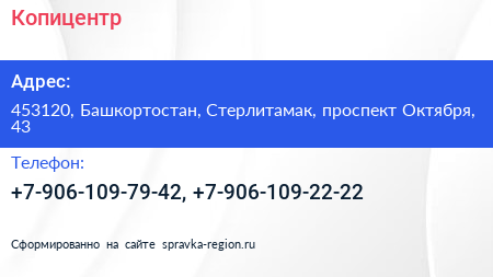 Копицентр по адресу 453120, Башкортостан, Стерлитамак, проспект Октября, 43 в дальнейшем Организация, размещена в следующих категориях:
