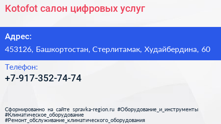 Kotofot, салон цифровых услуг по адресу 453126, Башкортостан, Стерлитамак, Худайбердина, 60 в дальнейшем Организация, размещена в следующих категориях: