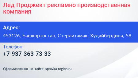 Лед Проджект, рекламно-производственная компания по адресу 453126, Башкортостан, Стерлитамак, Худайбердина, 58 в дальнейшем Организация, размещена в следующих категориях: