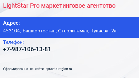 LightStar Pro, маркетинговое агентство по адресу 453104, Башкортостан, Стерлитамак, Тукаева, 2а в дальнейшем Организация, размещена в следующих категориях: