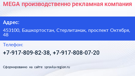 MEGA, производственно-рекламная компания по адресу 453100, Башкортостан, Стерлитамак, проспект Октября, 48 в дальнейшем Организация, размещена в следующих категориях: