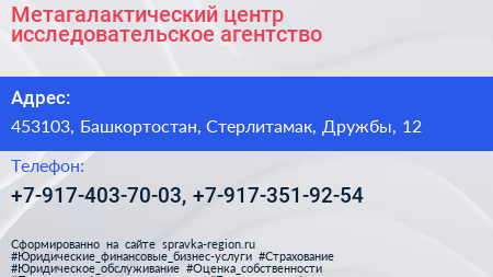 Метагалактический центр, исследовательское агентство по адресу 453103, Башкортостан, Стерлитамак, Дружбы, 12 в дальнейшем Организация, размещена в следующих категориях: