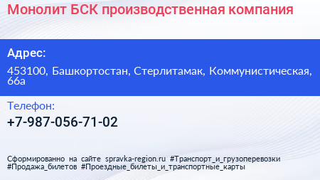 Монолит БСК, производственная компания по адресу 453100, Башкортостан, Стерлитамак, Коммунистическая, 66а в дальнейшем Организация, размещена в следующих категориях: