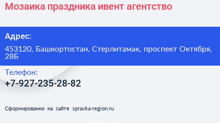 Мозаика праздника, ивент-агентство по адресу 453120, Башкортостан, Стерлитамак, проспект Октября, 28Б в дальнейшем Организация, размещена в следующих категориях: