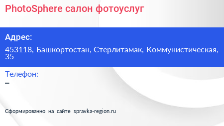 PhotoSphere, салон фотоуслуг по адресу 453118, Башкортостан, Стерлитамак, Коммунистическая, 35 в дальнейшем Организация, размещена в следующих категориях: