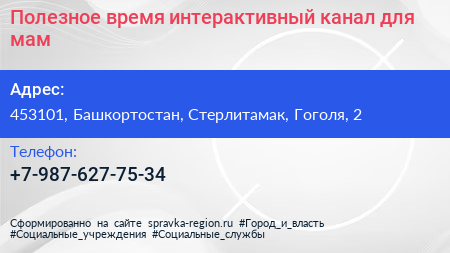 Полезное время, интерактивный канал для мам по адресу 453101, Башкортостан, Стерлитамак, Гоголя, 2 в дальнейшем Организация, размещена в следующих категориях: