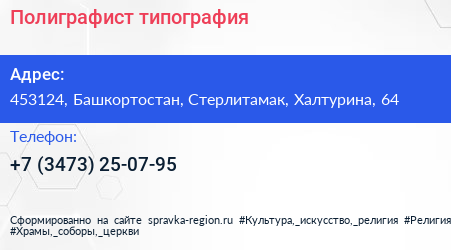 Полиграфист, типография по адресу 453124, Башкортостан, Стерлитамак, Халтурина, 64 в дальнейшем Организация, размещена в следующих категориях: