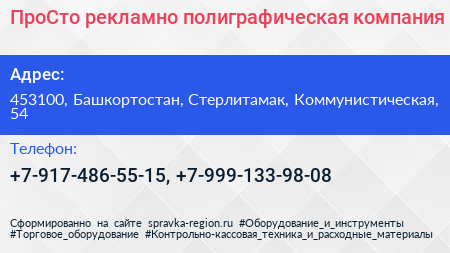 ПроСто, рекламно-полиграфическая компания по адресу 453100, Башкортостан, Стерлитамак, Коммунистическая, 54 в дальнейшем Организация, размещена в следующих категориях: