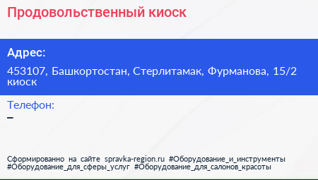 Продовольственный киоск по адресу 453107, Башкортостан, Стерлитамак, Фурманова, 15/2 киоск в дальнейшем Организация, размещена в следующих категориях: