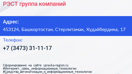 РЭСТ, группа компаний по адресу 453124, Башкортостан, Стерлитамак, Худайбердина, 17 в дальнейшем Организация, размещена в следующих категориях: