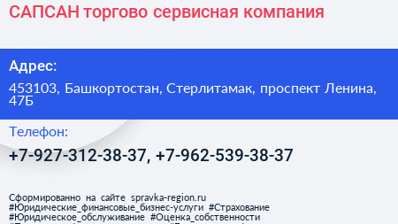 САПСАН, торгово-сервисная компания по адресу 453103, Башкортостан, Стерлитамак, проспект Ленина, 47Б в дальнейшем Организация, размещена в следующих категориях: