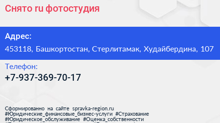 Снято.ru, фотостудия по адресу 453118, Башкортостан, Стерлитамак, Худайбердина, 107 в дальнейшем Организация, размещена в следующих категориях: