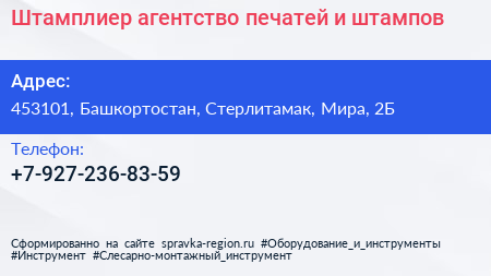 Штамплиер, агентство печатей и штампов по адресу 453101, Башкортостан, Стерлитамак, Мира, 2Б в дальнейшем Организация, размещена в следующих категориях: