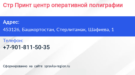 Стр-Принт, центр оперативной полиграфии по адресу 453126, Башкортостан, Стерлитамак, Шафиева, 1 в дальнейшем Организация, размещена в следующих категориях: