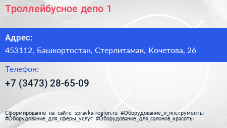 Троллейбусное депо №1 по адресу 453112, Башкортостан, Стерлитамак, Кочетова, 26 в дальнейшем Организация, размещена в следующих категориях:
