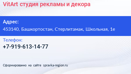 VitArt, студия рекламы и декора по адресу 453140, Башкортостан, Стерлитамак, Школьная, 1е в дальнейшем Организация, размещена в следующих категориях:
