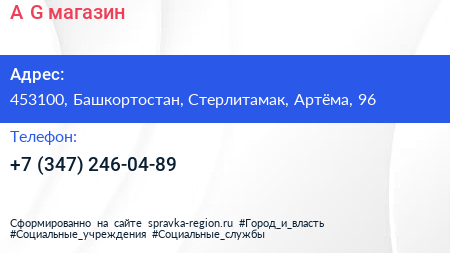 A & G, магазин по адресу 453100, Башкортостан, Стерлитамак, Артёма, 96 в дальнейшем Организация, размещена в следующих категориях: