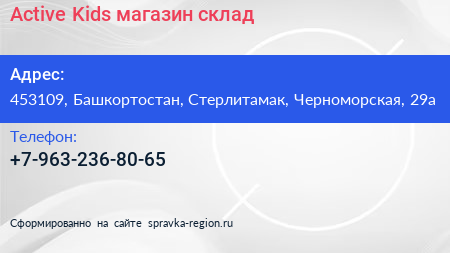 Active Kids, магазин-склад по адресу 453109, Башкортостан, Стерлитамак, Черноморская, 29а в дальнейшем Организация, размещена в следующих категориях: