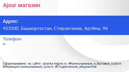 Ajour, магазин по адресу 453100, Башкортостан, Стерлитамак, Артёма, 96 в дальнейшем Организация, размещена в следующих категориях: