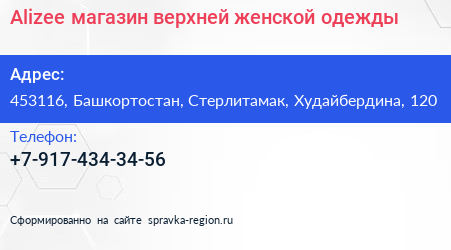 Alizee, магазин верхней женской одежды по адресу 453116, Башкортостан, Стерлитамак, Худайбердина, 120 в дальнейшем Организация, размещена в следующих категориях: