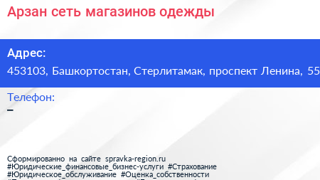 Арзан, сеть магазинов одежды по адресу 453103, Башкортостан, Стерлитамак, проспект Ленина, 55 в дальнейшем Организация, размещена в следующих категориях: