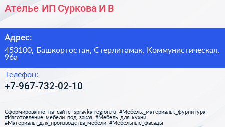 Ателье, ИП Суркова И.В. по адресу 453100, Башкортостан, Стерлитамак, Коммунистическая, 96а в дальнейшем Организация, размещена в следующих категориях: