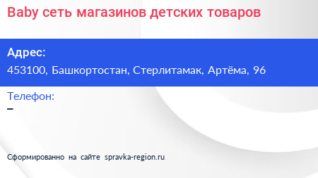 Baby, сеть магазинов детских товаров по адресу 453100, Башкортостан, Стерлитамак, Артёма, 96 в дальнейшем Организация, размещена в следующих категориях: