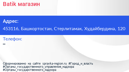 Batik, магазин по адресу 453116, Башкортостан, Стерлитамак, Худайбердина, 120 в дальнейшем Организация, размещена в следующих категориях:
