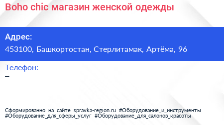 Boho chic, магазин женской одежды по адресу 453100, Башкортостан, Стерлитамак, Артёма, 96 в дальнейшем Организация, размещена в следующих категориях: