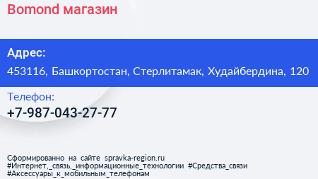 Bomond, магазин по адресу 453116, Башкортостан, Стерлитамак, Худайбердина, 120 в дальнейшем Организация, размещена в следующих категориях: