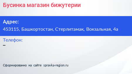 Бусинка, магазин бижутерии по адресу 453115, Башкортостан, Стерлитамак, Вокзальная, 4а в дальнейшем Организация, размещена в следующих категориях: