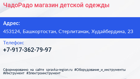 ЧадоРадо, магазин детской одежды по адресу 453124, Башкортостан, Стерлитамак, Худайбердина, 23 в дальнейшем Организация, размещена в следующих категориях:
