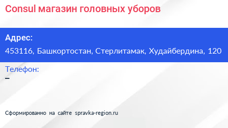 Consul, магазин головных уборов по адресу 453116, Башкортостан, Стерлитамак, Худайбердина, 120 в дальнейшем Организация, размещена в следующих категориях: