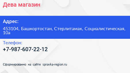 Дева, магазин по адресу 453104, Башкортостан, Стерлитамак, Социалистическая, 10а в дальнейшем Организация, размещена в следующих категориях: