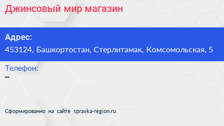 Джинсовый мир, магазин по адресу 453124, Башкортостан, Стерлитамак, Комсомольская, 5 в дальнейшем Организация, размещена в следующих категориях: