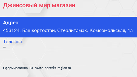 Джинсовый мир, магазин по адресу 453124, Башкортостан, Стерлитамак, Комсомольская, 1а в дальнейшем Организация, размещена в следующих категориях:
