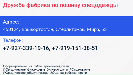 Дружба, фабрика по пошиву спецодежды по адресу 453124, Башкортостан, Стерлитамак, Мира, 53 в дальнейшем Организация, размещена в следующих категориях:
